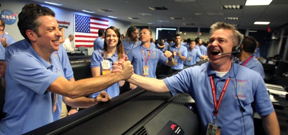 Flight director Keith Comeaux, right, celebrates with Martin Greco after a successful landing of NASA’s Mars Science Laboratory Curiosity rover at Jet Propulsion Laboratory on August 5, 2012 in Pasadena, California.