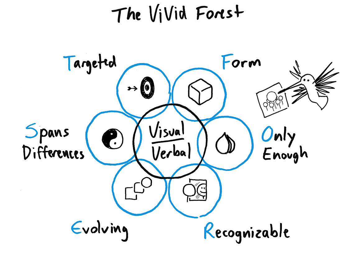 Roam: The central concept behind Blah-Blah-Blah is that vivid ideas – ideas that stand out in their clarity and stick through their simplicity – all share a basic set of common elements. Vivid ideas have form, show only their essentials, are recognizable, evolve, span differences, and are targeted. To achieve each of these criteria, Vivid ideas must be approach from both the verbal and visual perspectives. Vivid ideas and ideas that stick are the same thing – I just hotwire the approach by adding words and pictures.