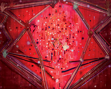 Artwork: Jules de Balincourt, Ecstatic Contact, 2012, oil, acrylic, and spray paint on panel, 96″ x 120″