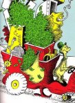 For those of you who don’t remember the story, the sneetches (yellow characters that vaguely resemble ostriches) start the book as a divided crowd. One group of sneetches has stars on their stomachs. They consider themselves superior to the sneetches without “stars upon thars.” Then Sylvester McMonkey McBean arrives with a machine that can put a star on a sneetch’s chest. Much to the star-bellied sneetches dismay, the non-starred sneetches go through the procedure. Then, of course, the star isn’t special anymore, so McBean unveils a star removal machine. Hilarity ensues.